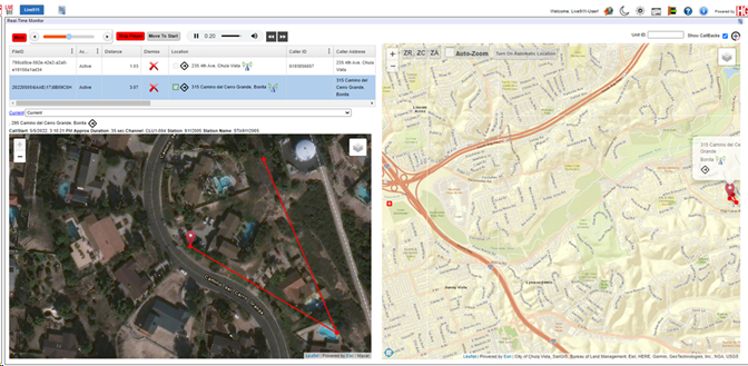 Live911 provides the ability for first responders in the field, as well as any support personnel such as Watch Commanders, UAS Operators (DFR), Real Time Crime Center (RTCC) Staff, Incident Commanders, EOC Staff, etc., to monitor the location and audio of incoming 911 emergency calls. The geo-tagged call is provided to those field personnel within a pre-determined radius. The intent is to provide first responders with the most immediate and complete information of an ongoing emergency incident.